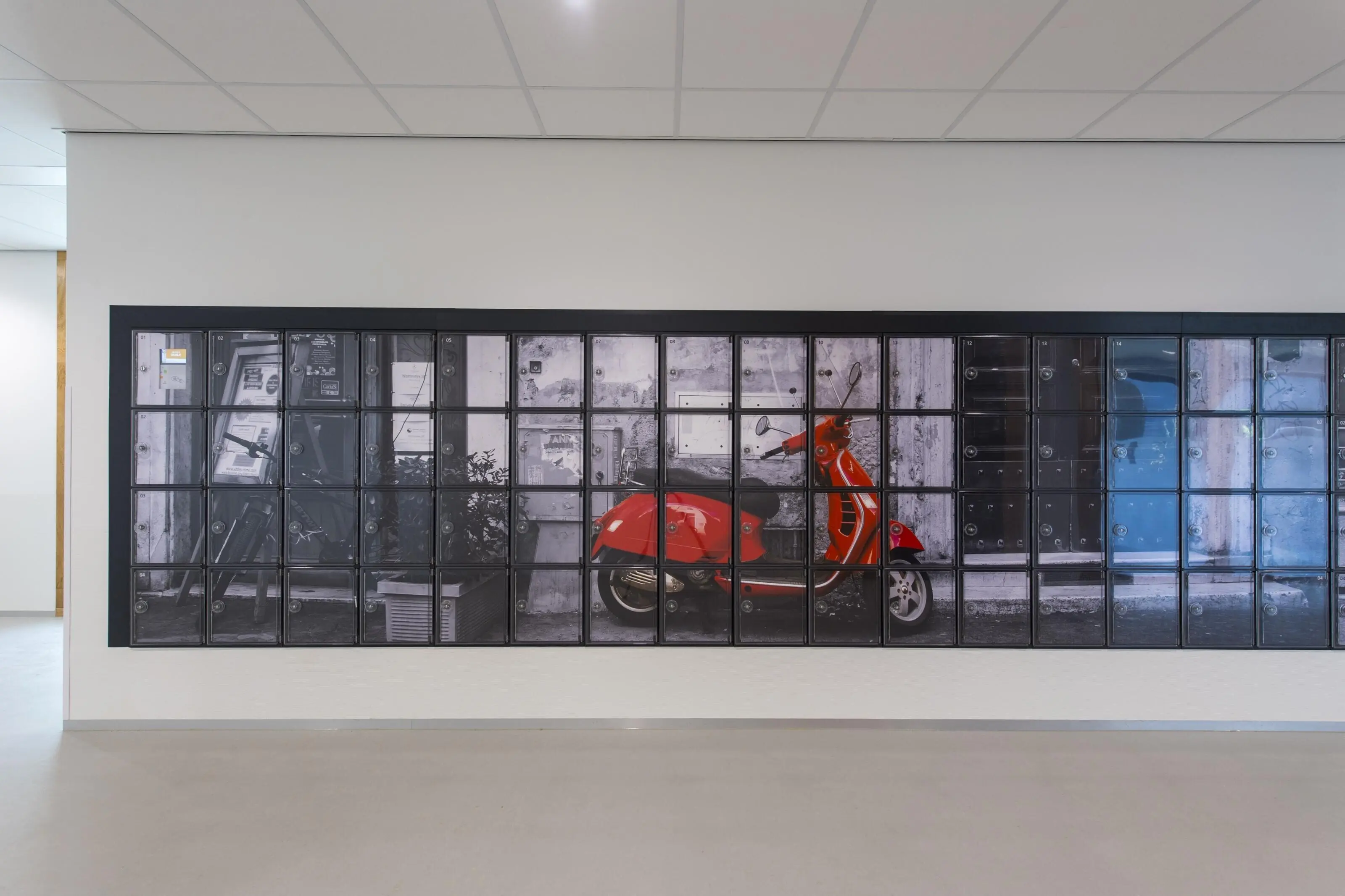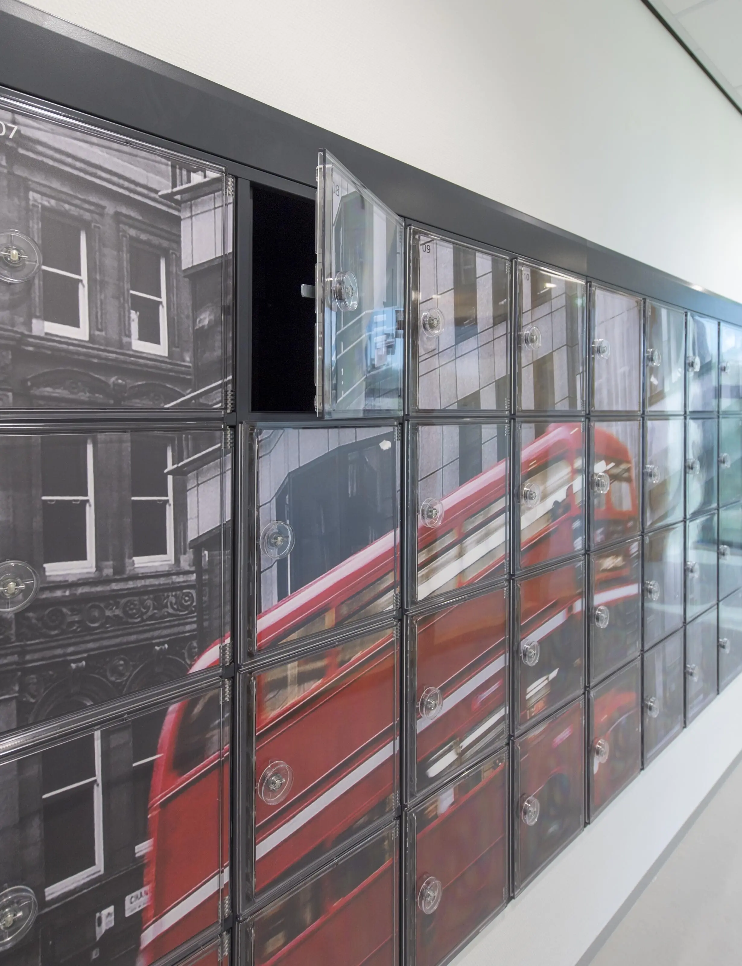 Met de Themaline kasten van Noki Lock voegt u niet alleen opbergruimte toe, maar ook beleving. Deze lockers zijn ontworpen om ruimtes visueel te verrijken door middel van thematische beelden, prints of projecties. Dankzij de transparante, krasvaste deuren kunnen afbeeldingen zoals landschappen, grafische patronen of een bedrijfslogo op een stijlvolle manier worden gepresenteerd.